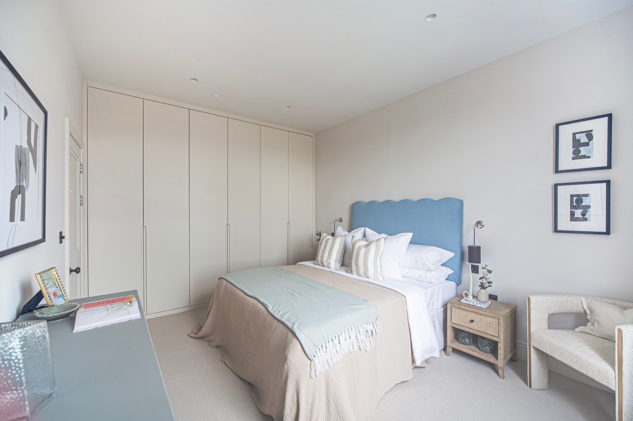 The wardrobe features six doors made from high-quality lacquered MDF, 22mm thickness, which is a very smooth and durable finish. Each door is designed with integrated handles, offering a clean and modern look that enhances the room’s overall design. The exterior is sprayed in Farrow & Ball’s sophisticated Skimming Stone, a versatile neutral shade that brings a touch of elegance to the space.