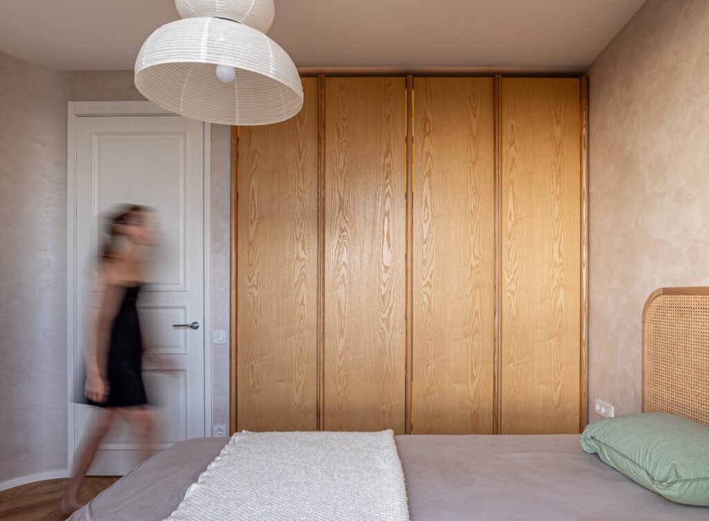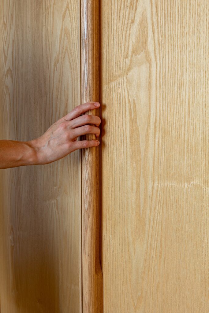 The exterior is made entirely from real wood, giving each piece its own unique grain and character. The design features a bi-fold door system, carefully framed in solid timber profiles that also act as full-height handles. This detail not only adds a tactile and sculptural quality but also creates a beautiful rhythm across the wardrobe front, highlighting the natural texture and warmth of the wood.