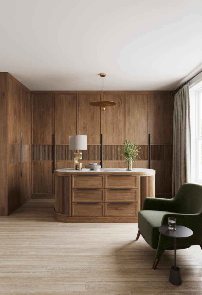 The decision to use brushed antique metal handles adds more character. It has a sophisticated affluent feel that is completely in keeping with its prime location in Canary Wharf.